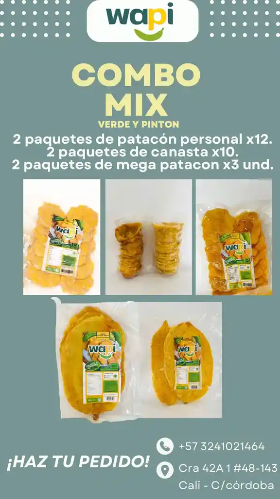 COMBO PATACON PRECOCIDO CONGELADO EMPACADO AL VACIO. CONTIENE: Linea verde (1 patacón personal x 12, 1 canasta x 10, 1 mega patacón x 3, sopero). Linea pintón (1 patacón personal x 12, 1 canasta x 10, 1 mega patacón x 3)