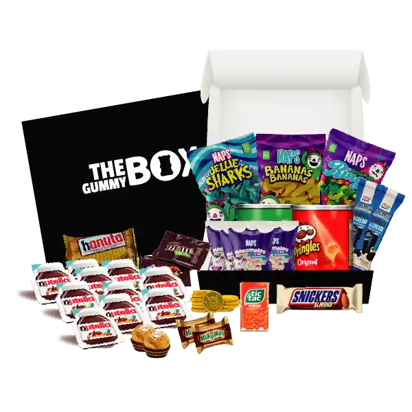 Contiene. Pringles Original Tarro 37 g + Pringles Crema Cebolla Tarro 40 g + Bananas Ácidas Naps Bolsa 100 g + Tiburones Dulces Naps Bolsa 100 g + Anillos Dulces Bolsa 100 g + Napolinos Barquillos Cookies & Cream Naps 2 x 14 g c/u + Napsmelos Surtido (Vainilla Fresa y Frambuesa) + Monedas Chocolate Color Dorado 4 Und + Naps Bolsa 1000 g + Snickers de Almendra Bara 10 x 58 g c/u + M&M Chocolate Mini 2 Und + Snickers Mini 2 x 9 g c/u + Tic Tac. Naranja 1 Und + Ferrero Rocher 2 x 37.5 g c/u + Hanuta 1 Und + Mini Nutella 10 x 15 g c/u