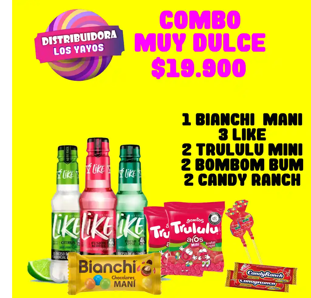 Combo muy dulce, Incluye 3 like (diferentes sabores), 1 bianchi chocolores maní, 2 trulu mini (40grms), 2 bbb, 2 candy ranch