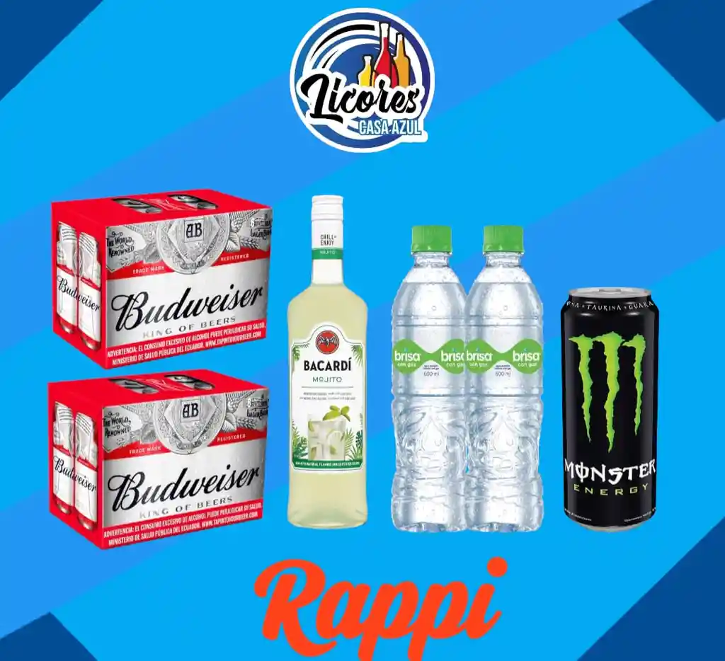 2 six pack budweiser 269ml 1 botella bacardi mojito 2 agua brisa con gas 1 monster energy