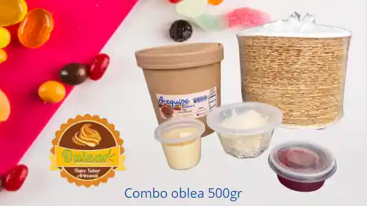 Arequipe artesanal de 500g sin ingrediente + paquete de obleas de 30 unid + salsa de mora + crema de leche + queso rallado
