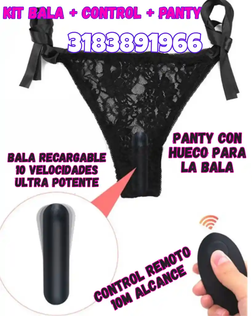 Combo ultra practico con: 1) Una bala vibradora Recargable. Super potente, Pequeña y discreta. Perfecta para estimulación clitorial. 10 modos de vibración. 2) Control Remoto para manejarla a distancia Alcance hasta 10 metros 3) Panty con bolsillo para bala Estimula placentera y cómodamente 100% discreto *Se adapta de la talla 6-12 pantalon COLOR NEGRO