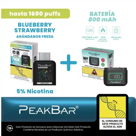 Combo batería más pod peak bar 16k sabor Arándanos Fresa hasta 16.000 Puffs. 5% nicotina. Producto exclusivo para mayores de edad. Este producto contiene nicotina. La nicotina es un quimico adictivo.