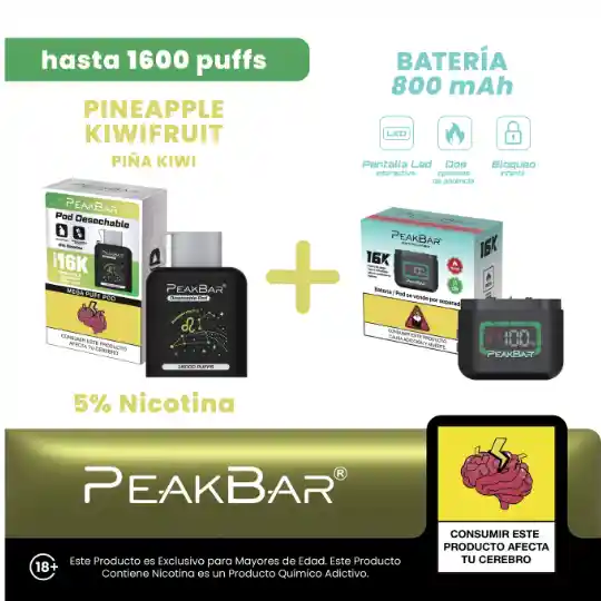 Combo batería más pod peak bar 16k sabor Piña Kiwi hasta 16.000 Puffs. 5% nicotina. Producto exclusivo para mayores de edad. Este producto contiene nicotina. La nicotina es un quimico adictivo.