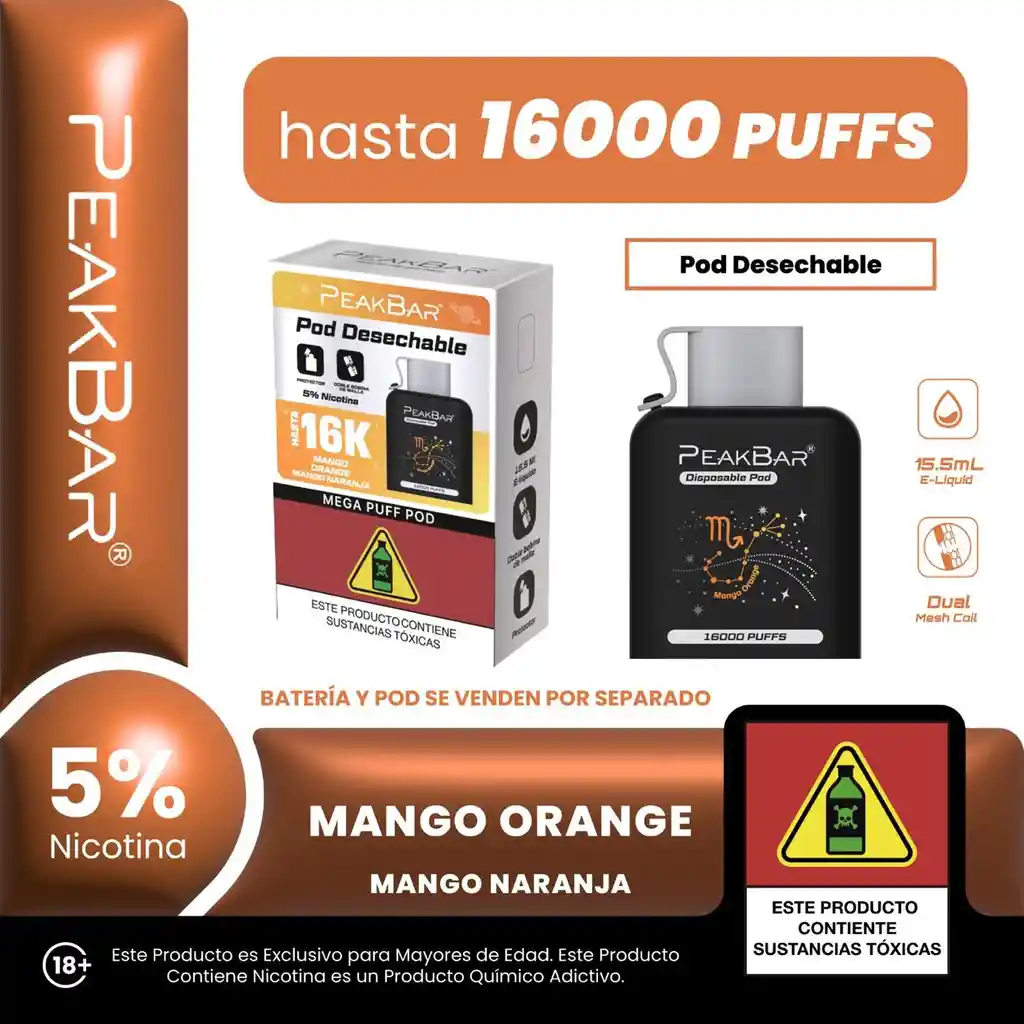 Intensidad tropical con el equipo completo ⚡ Incluye batería + pod 16K para que no tengas que comprar nada adicional. El mango maduro aporta dulzura profunda y la naranja le da ese golpe cítrico vibrante que resalta cada inhalación. ✨ Hasta 16.000 puffs ✨ 5% nicotina ✨ 15.5 mL de e-liquid ✨ Dual Mesh Coil ✨ Batería recargable incluida Perfecto para quienes prefieren sabores fuertes y con personalidad.