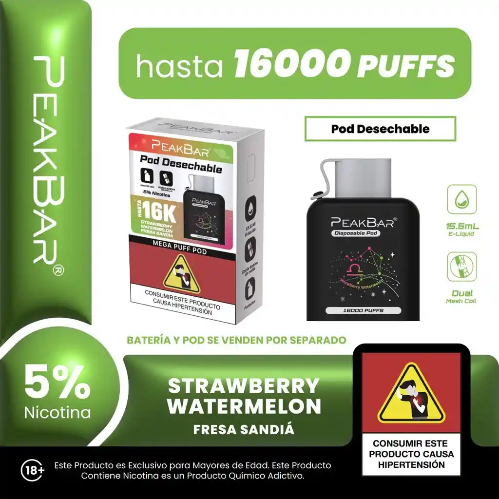 Dulce, suave y refrescante en versión completa 🔥 Incluye batería + pod 16K listo para disfrutar. La combinación clásica de fresa dulce y sandía jugosa crea un vape ligero, equilibrado y perfecto para todo el día. ✨ Hasta 16.000 puffs ✨ 5% nicotina ✨ 15.5 mL de e-liquid ✨ Dual Mesh Coil ✨ Batería recargable incluida Una opción segura si buscas sabor frutal sin empalagar.