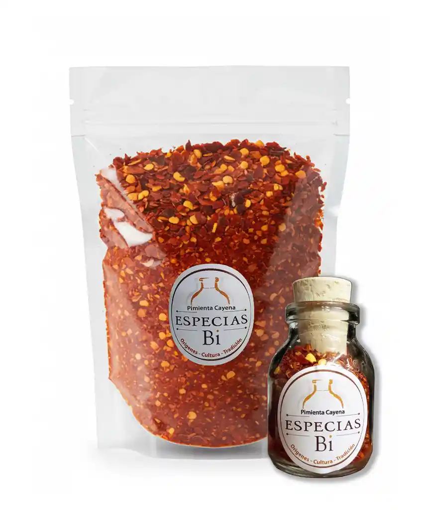 Combo Pimienta Cayena Escamas 100g - (Doypack de 75g + frasco de 25g) La pimienta cayena en escamas de Especias Bi es un condimento picante y aromático elaborado a partir de chiles seleccionados, deshidratados y triturados para conservar su color rojo intenso, su sabor penetrante y su característico picor. Su textura en escamas permite una liberación gradual del sabor, ideal para quienes buscan intensidad, equilibrio y un toque ardiente en sus preparaciones. Usos sugeridos La pimienta cayena en escamas es un ingrediente versátil que realza el sabor de múltiples recetas: -Pizzas y pastas: espolvoréala al final para un toque picante y aromático. -Carnes y parrillas: excelente para adobos, marinadas y rubs secos. Sopas y guisos: aporta calidez y profundidad al sabor. -Tacos, burritos y comida mexicana: realza la experiencia auténtica con picante equilibrado. -Mariscos: perfecta para camarones, calamares y pescados. Salsas, dips y vinagretas: añade un picor vibrante sin alterar la textura. -Huevos y desayunos salados: ideal sobre omelettes, huevos en tortilla o shakshuka. Beneficios para la salud -La pimienta cayena no solo aporta sabor, sino también propiedades valiosas para el bienestar: -Estimula el metabolismo: la capsaicina ayuda a aumentar el gasto energético y favorecer la quema de calorías. -Mejora la circulación: contribuye a la salud cardiovascular al promover la vasodilatación. -Apoya la digestión: incrementa la producción de jugos gástricos y puede ayudar a mejorar la digestión. -Propiedades antiinflamatorias y antioxidantes: ayuda a combatir radicales libres y reducir inflamaciones leves. -Ayuda a descongestionar: su efecto térmico contribuye a aliviar congestión nasal y mejorar la respiración. -Puede reducir el apetito: la capsaicina genera sensación de saciedad en algunas personas.