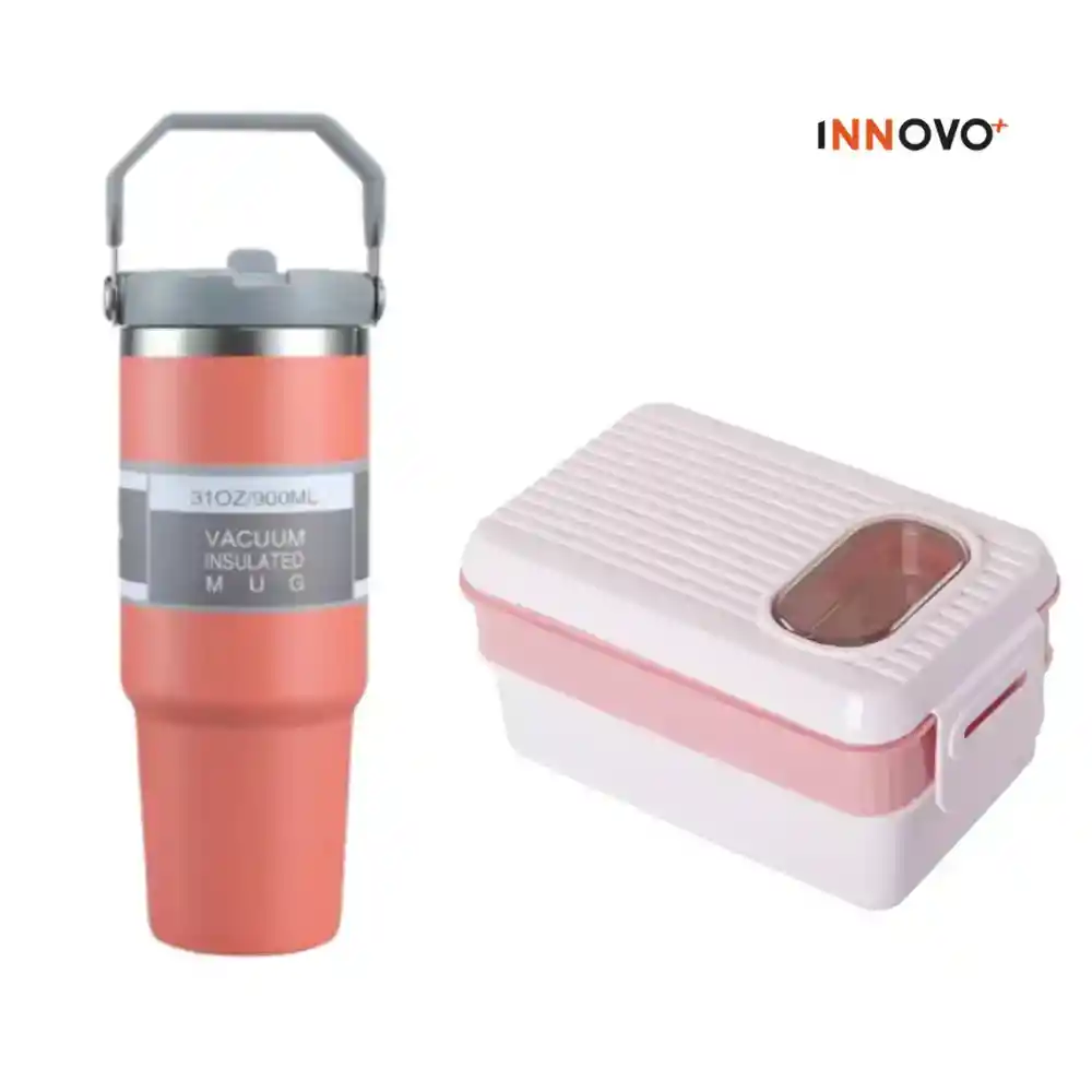 COMBO PINK PORTA COMIDAS DOBLE COMPARTIMIENTO + TERMO MANIJA 900ML ¡Lleva tus comidas y bebidas de manera práctica y con estilo! Porta Comidas Doble Compartimiento Diseño compacto y hermético. Dos niveles para separar tus alimentos. Ideal para el trabajo, escuela o viajes. Termo con Manija 900ml Rosa Mantiene la temperatura de tus bebidas por horas. Asa ergonómica para un transporte cómodo. Perfecto para café, té, jugos o agua. ¡Comodidad y funcionalidad en un solo combo!
