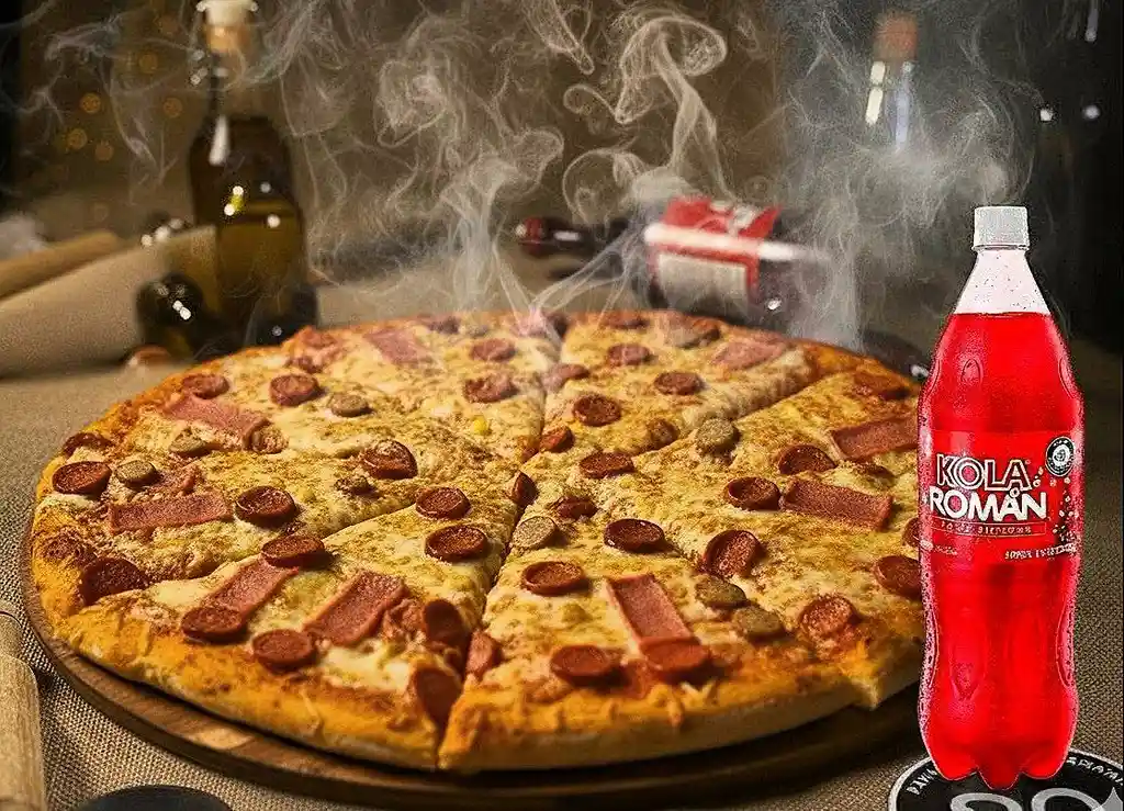 PIZZA CON QUESO MOSARRELA CON - PEPPERONI - SALAMI Y JAMON CON POSIBILIDAD DE DIVIDIRSE DE 8 - 12 - 16 PORCION + KOLA ROMAN 1.5 ADICIONAL