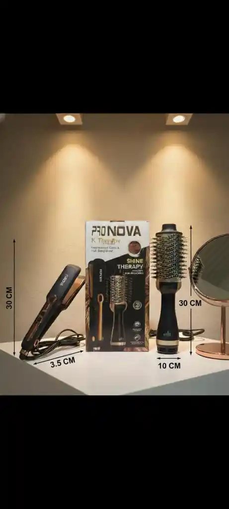 💥 *COMBO BELLEZA PRO NOVA K-THERAPY 3602* 💥 • FUNCIÓN: Set profesional de estilizado dual (Cepillo Voluminizador + Plancha Alisadora) diseñado para secar, alisar y dar volumen, reduciendo el frizz gracias a su tecnología de iones. • CARACTERÍSTICAS: Tecnología Shine Therapy: Recubrimiento de cerámica con microacondicionadores de Argán, Keratina, Aguacate y Macadamia. Cepillo de Aire: Diseño ovalado ergonómico con cerdas mixtas y tres niveles de calor/velocidad para un secado tipo "blowout". Plancha de Cabello: Placas delgadas y flotantes para un alisado rápido o creación de ondas, con cable giratorio de 360°. Seguridad: Sistema de protección contra sobrecalentamiento y puntas frías para un manejo seguro. • MEDIDAS DEL PRODUCTO: Cepillo Voluminizador: Largo 34 CM x Diámetro 10 CM. Plancha Alisadora: Largo 30 CM x Ancho 3.5 CM. • REFERENCIA: PRO-3602.