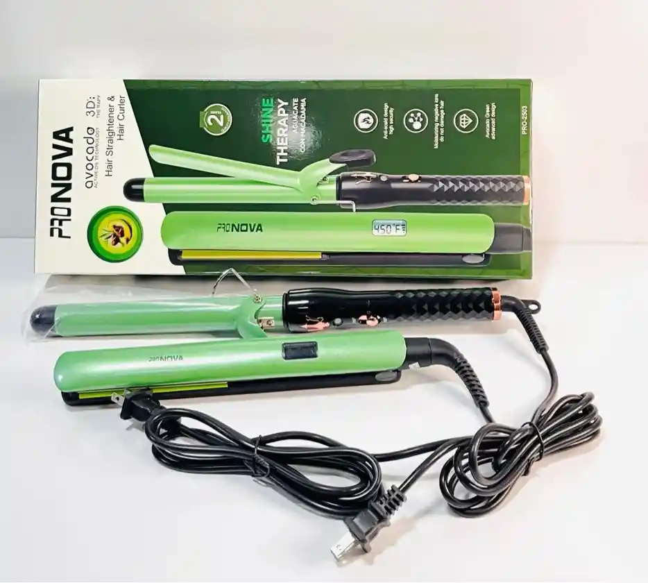 Es un combo de herramientas 2 en 1 para peinar el cabello. Cuenta con placas de cerámica con infusión de aceite de aguacate y macadamia para nutrir el cabello mientras se peina. La plancha y la pinza están diseñadas para dar brillo y suavidad al cabello. Puede alcanzar temperaturas de hasta 450°F (aproximadamente 230°C).
