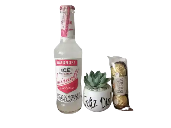 Planta suculenta variada en matera de cerámica redonda 5 cm Alto x 5 cm ancho aprox. color a elección + Smirnoff y ferrero x3. Un perfecto detalle para el día del padre. Incluye bolsa de regalo.