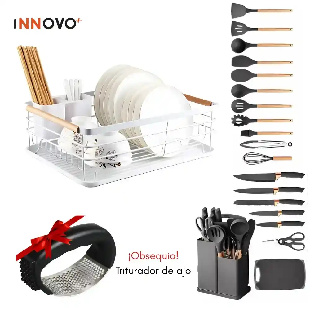 Combo Cocina Premium Incluye: Platero Escurridor con mangos de madera – Elegante, resistente y funcional. Platero Escurridor INNOVO HOME – Elegancia y Funcionalidad en tu Cocina Diseño moderno y elegante en color blanco, ideal para cualquier estilo de cocina. Material resistente de acero con mangos de madera para mayor durabilidad. Organiza tu loza de forma práctica y eficiente, optimizando el espacio. Fácil de limpiar y mantener, perfecto para el día a día. Dale un toque sofisticado a tu cocina con el Platero Escurridor INNOVO HOME. Set de Utensilios x19 Piezas en silicona con mango de madera – Protege tus ollas y facilita la cocina. Set de Utensilios x19 Piezas en Silicona con Mango de Madera El complemento perfecto para tu cocina 19 piezas esenciales para preparar cualquier receta. Silicona de alta calidad, resistente al calor y segura para tus ollas. Mangos de madera elegantes y cómodos para un mejor agarre. Durabilidad y diseño moderno para darle un toque sofisticado a tu cocina. Cocina con estilo y sin rayar tus utensilios favoritos. ¡Llévalo ahora! ¡Obsequio especial! Triturador de ajo – Ahorra tiempo y disfruta de preparaciones más rápidas. Machacador de Ajo 2 en 1 – Práctico y Multifuncional ¡Haz que cocinar sea más fácil con este triturador de ajo multifuncional! Con su diseño ergonómico y sistema de prensado en acero inoxidable, podrás triturar ajo sin esfuerzo y sin ensuciarte las manos. Fácil de usar – Presiona y tritura sin complicaciones. Diseño 2 en 1 – Machaca ajos y también puedes usarlo como ablandador de carne. Material resistente – Fabricado en acero inoxidable y mango ergonómico para mayor comodidad. Fácil de limpiar – Solo enjuaga con agua o colócalo en el lavavajillas. ¡Aprovecha esta herramienta de cocina y dale un toque profesional a tus platillos! Calidad, estilo y practicidad en un solo combo. ¡No te quedes sin el tuyo!