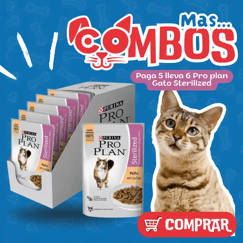 ¡Más sabor, más salud para tu gato esterilizado! Compra 5 pouch Pro Plan Gato Sterilized 85g y llévate el 6º GRATIS. Nutrición especializada para gatos esterilizados Ayuda a mantener un peso saludable y sistema urinario equilibrado Textura y sabor irresistibles Ideal para mimarlo todos los días sin descuidar su salud ¡Aprovecha esta promo y llévate más por menos!