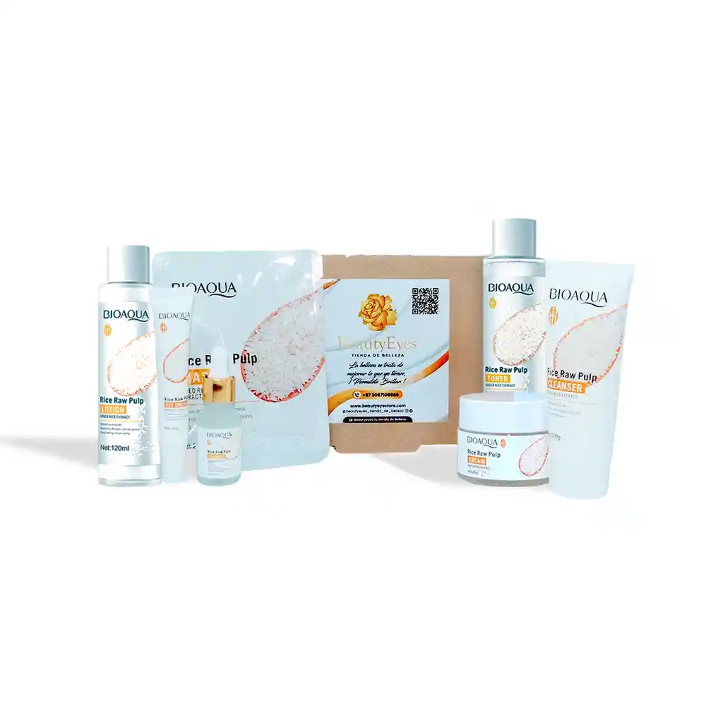 1 Combo premium Skin Care Extractos de arroz: El paquete incluye: 1 Locion hidratante de arroz 120 ml 1 Serum Arroz Bioaqua 15ml 1 Contorno de ojos Bioaqua 20gr 1 Tonico de arroz 120ml 1 Crema hidratante arroz 50gr 1 Exfoliante en gel de arroz 140gr 1 Jabon Facial de arroz