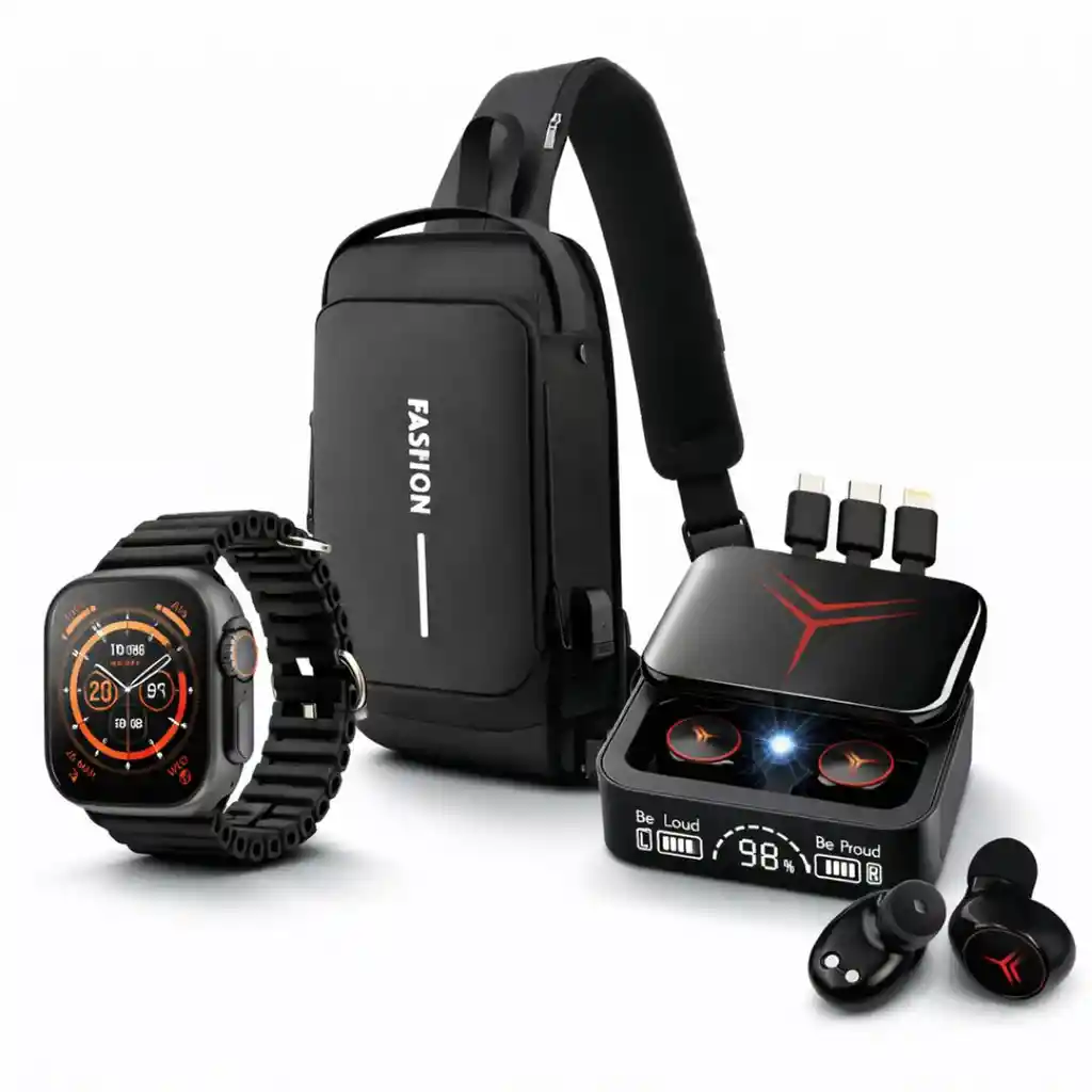 Si te mueves todo el día, este combo va contigo Hay productos que se quedan en casa… y otros que realmente se adaptan a tu ritmo. Este combo está diseñado para acompañarte en movimiento, ya sea en el trabajo, en la calle o en tus momentos de descanso. El reloj T900 Ultra aporta presencia y funcionalidad en tu muñeca, los audífonos M88 te aíslan del ruido y te conectan con lo que quieres escuchar, y el bolso antirrobo protege lo que llevas contigo mientras incluso te permite cargar tu celular. Es una elección pensada para quienes buscan practicidad real sin perder estilo. Especificaciones: Set tecnológico que incluye smartwatch T900 Ultra con diseño deportivo y tornillería visible, audífonos Bluetooth M88 gamer con base de carga digital, bolso antirrobo negro con puerto USB integrado, sistema de almacenamiento interno y materiales duraderos. Incluye: 1 smartwatch T900 Ultra, 1 audífonos M88 gamer con estuche, 1 bolso antirrobo negro. Garantía: Garantía de 30 días por defectos de fabricación Política de retracto: 5 días hábiles desde la recepción del producto, siempre que esté completo y sin uso. Nota importante: Si el producto llega golpeado o con piezas faltantes, repórtalo en las primeras 24 horas a la transportadora. Para aplicar la garantía, envía fotos y videos donde se evidencie el defecto.