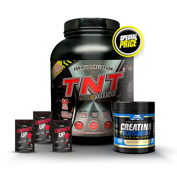 Lleva esta increíble combo de Proteína Hipercalórica TNT de 6 libras + Creatina HCL con Glutamina ALL in ONE + 3 Sobres de Energy UP