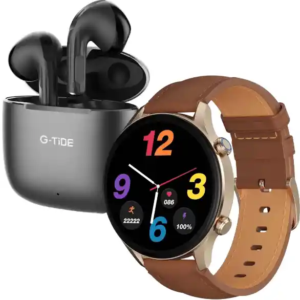 Combo G-TiDE R2 PRO + H11: Rendimiento, Conectividad y Comodidad Este combo une lo mejor de dos mundos: un reloj inteligente completo y unos audífonos originales perfectos para trabajar, hacer ejercicio o relajarte. El G-TiDE R2 PRO destaca por sus sensores de salud y conectividad, mientras que los H11 ofrecen audio de alta calidad y emparejamiento instantáneo. Características destacadas del reloj: Registro de pasos, calorías y distancia Control de salud con sensores integrados Recibe notificaciones, llamadas y alertas Batería de varios días con carga rápida Características clave de los audífonos H11: Bluetooth 5.0 con conexión estable Micrófono integrado para llamadas claras Estuche de carga magnético Controles táctiles multifunción Nota de garantía: Este combo cuenta con una garantía de 6 MESES contra defectos de fábrica. No aplica a daños por líquidos o mal uso del producto.