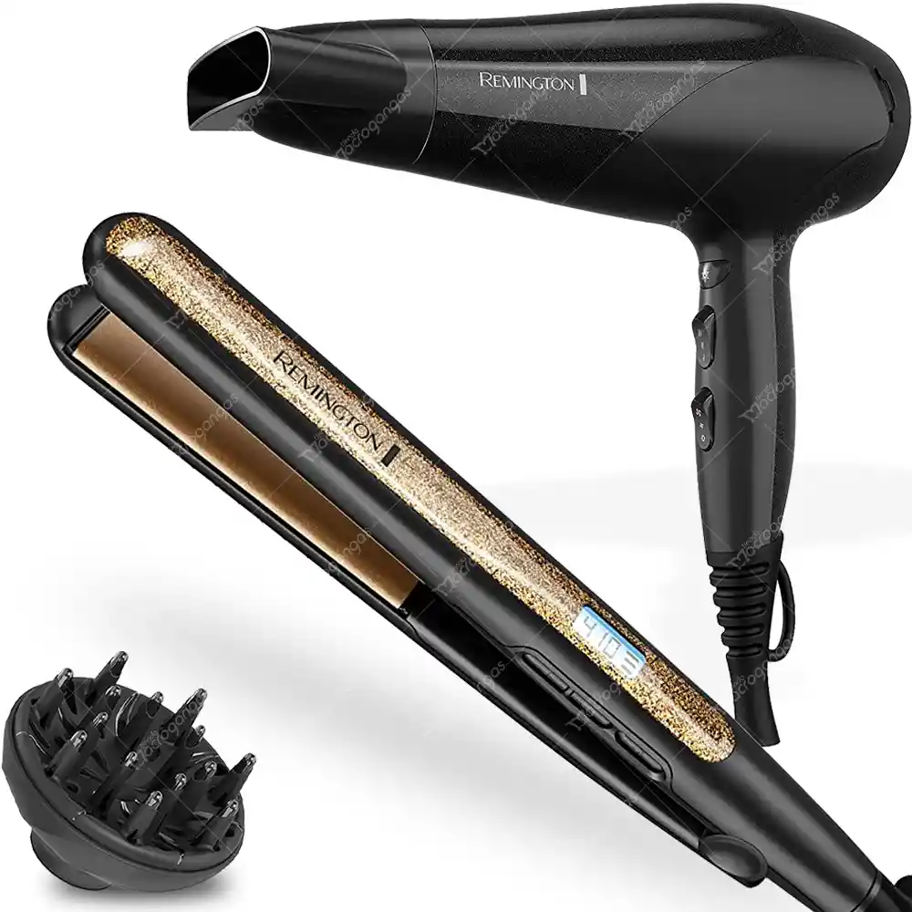 COMBO REMINGTON PLANCHA ANTIFRIZZ Y SECADOR IONICO SECADOR DE PELO REMINGTON PROTECCIÓN CONTRA DAÑOS | D3190 Consigue un cabello brillante y saludable* con el secador de pelo REMINGTON Daño Protection. La tecnología avanzada de recubrimiento ofrece 3 veces más de protección* durante el peinado, y nuestra tecnología patentada Micro-Conditioner mantiene tu cabello más saludable*. Este secador combina tecnologías de cerámica + iónica + turmalina con 1875 W de potencia máxima para estilos rápidos y saludables y menos encrespamiento. Con tres ajustes de calor y dos velocidades, puedes encontrar el rendimiento del flujo de aire que prefieres para tu tipo de cabello. ESPECIFICACIONES SECADOR: Cerámica + Iónica + Tecnología Turmalina. Microacondicionadores 3 niveles de calor + 2 ajustes de velocidad + disparo frío. Potencia máxima de 1875 W. Concentrador y difusor Filtro extraíble. Bucle para colgar. Voltaje: 120 V. La plancha para cabello de Remington Shine Therapy con placas recubiertas de cerámica con macadamia puede lograr un cabello protegido y con aspecto brillante. Sus 8 diferentes ajustes de temperatura permiten seleccionar la temperatura que más se adecúa a tu tipo de cabello evitando causar daños en él. ESPECIFICACIONES PLANCHA: Medida de las placas: 2,54cm / 1" 8 Ajustes de Temperatura: 150°C - 230°C Calentamiento en 15 segundos Botón de Encendido y Apagado Placas Flotantes Recubiertas de cerámica y macadamia Luz indicadora LED Bloqueo de placas Apagado Automático Cable Giratorio de 1,8 m Cierre de seguridad CONTENIDO DEL EMPAQUE: 1x Secador Remington Tourmaline Ionic 1x Plancha Remington AntiFrizz 1x Boquilla concentradora 1x Boquilla Tipo Difusor