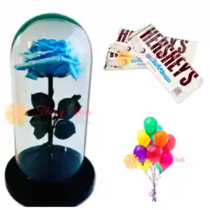 Rosa Preservada Azul cielo decorada+ Caja Sorpresa Decorada + 10 Globos en Helio + Hershey's Personal