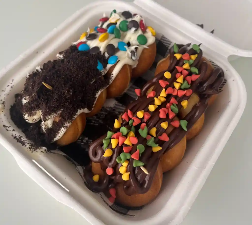 Combo de 8 mini donas, incluye: 2 salsas, 2 toppings clásicos, 1 topping especial.