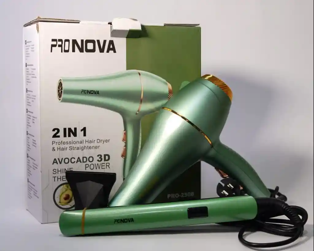 Incluye un secador de alta potencia y una plancha alisadora con placas cerámicas. Cuenta con tecnología "Avocado 3D Shine Therapy" que hidrata, da brillo y protege el cabello. El diseño es en un tono aguacate metálico con detalles dorados. La plancha puede alcanzar temperaturas de hasta \(450^{\circ }\text{F}\) (\(232^{\circ }\text{C}\)). El secador tiene 3 ajustes de temperatura y 2 velocidades, además de función "Cool Shot". El Combo Secador + Plancha Pro 2508 es una herramienta esencial para el cuidado del cabello. Este conjunto incluye un secador potente y una plancha de alta calidad, diseñados para ofrecer grandes resultados en la comodidad de tu hogar. El secador cuenta con múltiples configuraciones de temperatura y velocidad, permitiendo un secado rápido y eficiente. La plancha, por su parte, tiene placas de cerámica que distribuyen el calor uniformemente, logrando un alisado suave y duradero sin dañar el cabello. Ambos dispositivos son ligeros y fáciles de manejar, lo que facilita su uso diario. Ideal para quienes buscan un estilo impecable y un acabado brillante.