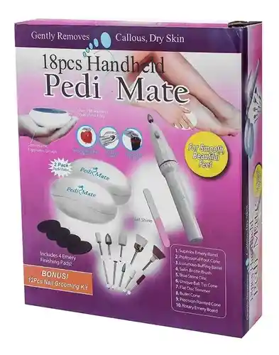 Lusca tus pies como siempre has querido, Sanos con uñas bien cuidadas y talones si piel muerta o callosidades PEDICURE PEDI MATE Te proporciona una delicada limpieza y una elegante y sana sensación de higiene personal, Lucirás súper bien para toda ocasión. Ahórra dinero visitando salones de estética, y házlo tu misma en tu casa, a tu propio gusto y en el tiempo que tu quieras dedicar a embellecerse. Características: Un kit de accesorios muy completo 18 piezas Una completa variedad de piezas en diferentes medidas, y de acuerdo a las necesidades del trabajo a realizar. Un diseño de fácil manejo