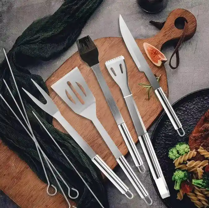 "El juego de accesorios para barbacoa de 18 piezas que incluye este kit es completo y profesional, contiene casi todo lo que necesita para asar a la parrilla. Calidad superior --- Nuestro juego de herramientas para barbacoa está hecho de acero inoxidable de alta calidad, por lo que cada uno de nuestros productos es resistente y duradero, no se oxida ni se agrieta (se recomienda secar antes de guardar). Todas las herramientas son fáciles de limpiar y aptas para lavavajillas. Herramientas para asar desde la perspectiva del usuario. Gracias al mango extendido, puede mantener una distancia segura de la parrilla caliente y minimizar el riesgo de quemaduras. QUE INCLUIYE NUESTRO SET: 1 Maletín 1 Espátula con cortador 1 Pinza 1 cuchillo 1 cepillo 1 brocha 1 tenedor 1 salero 1 pimentero 4 espadas 6 pinchos"