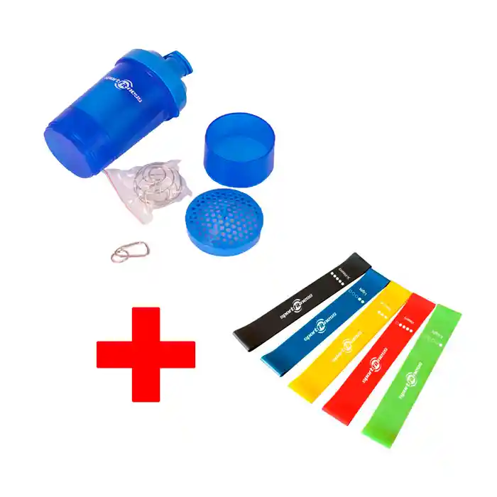 CARAMAÑOLA: >Vaso de 500 ml>Compartimiento pastillero>Compartimiento para proteína.>Esfera mezcladora en acero inoxidable.//BANDAS://Resistencias:>Verde: 9-18 lb>Azul: 14-25 lb>Amarillo: 17-30 lb>Rojo: 22-38 lb>Negro: 27-47 lb