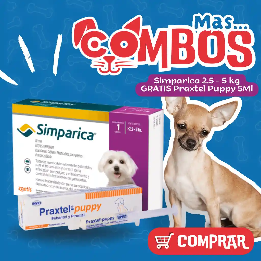 ¡Protección completa para tu cachorro! Llévate 1 caja de Simparica (2.5 – 5 kg, 1 tableta) y recibe GRATIS un antiparasitario Praxtel Puppy 5 ml. Simparica: protección efectiva contra pulgas, garrapatas y ácaros Praxtel: antiparasitario oral para combatir parásitos internos Ideal para cachorros pequeños Cuida su salud desde los primeros meses ¡Una combinación perfecta para mantener a tu cachorro sano y protegido!