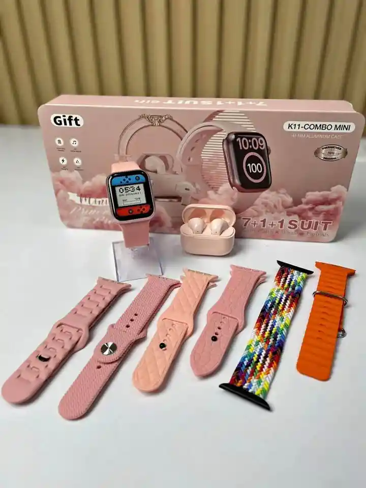 Combo Smart Watch K11 es un reloj inteligente que combina tecnología, estilo y funcionalidad. Diseño: Tiene una pantalla táctil de alta resolución, lo que ofrece una experiencia fluida y cómoda para el uso diario. Funciones: Incluye monitoreo de ritmo cardíaco, medición de oxígeno en la sangre, control del sueño y modos deportivos. Conectividad: Permite recibir notificaciones de llamadas, mensajes y aplicaciones en tiempo real a través de Bluetooth. Accesorios: El paquete incluye correas intercambiables, un cargador magnético y auriculares inalámbricos, lo que lo convierte en un paquete completo. Este smartwatch es compatible con dispositivos iOS y Android, lo que lo hace versátil para diferentes estilos de vida.