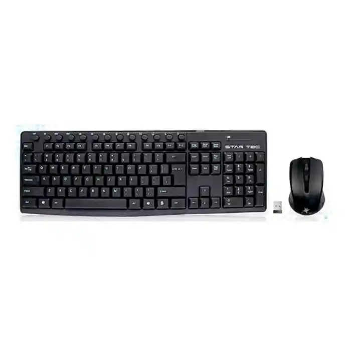 Marca: Startec Teclado inalámbrico multimedia con 13 teclas de acceso directo y 104 Batería AA Mouse inalámbrico con 1000 dpi- 2 baterías AAA Color: Negro