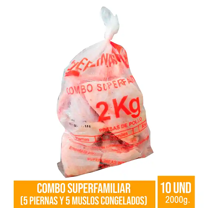 Combo Superfamiliar 10 presas, 5 piernas y 5 muslos congelados, presentación en bolsa de 2kg.