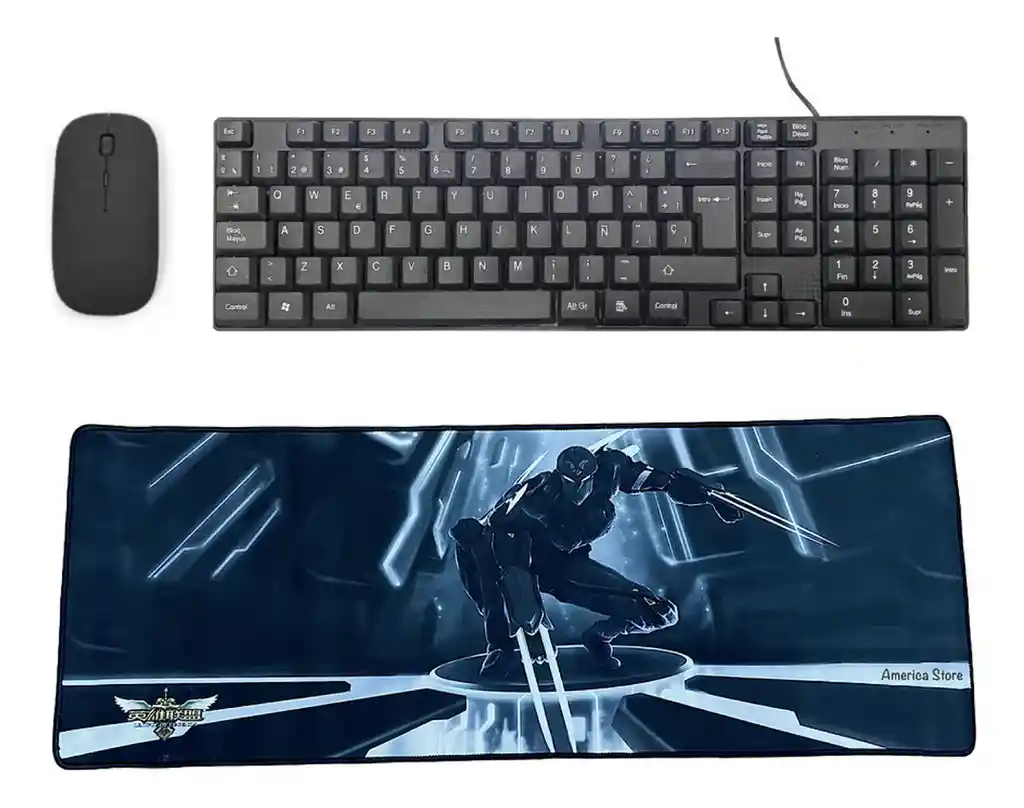 America Store te trae Combo de Teclado En Español Alambrico + Mouse Inalámbrico Ultra Delgado + Pad Mouse Antideslisante 79cm x 30cm CARACTERÍSTICAS MOUSE: Especificaciones: Interfaz USB 2.0 Trabajo: Óptico Voltaje de funcionamiento: 5V Número de teclas: 3 Resolución óptica: 1000DPI Ergonomía: Soporte Tamaño del producto aproximadamente 11.5 * 7 * 3.5 cm CARACTERÍSTICAS TECLADO: El teclado Multimedia más reciente en color negro, es compatible con sistemas Windows para mejorar su uso. El delgado diseño de las teclas brinda una excelente experiencia de escritura. Teclado estándar. Teclas delgadas para reducción de ruido. CARACTERÍSTICAS PAD MOUSE: Los bordes cosidos duraderos y la textura premium de alta densidad que se procesó en una cámara de alta temperatura 230 ° F para garantizar un uso a largo plazo sin deformación y desgomado. Tela en la cubierta para un deslizamiento suave. Se ha optimizado con un movimiento rápido, manteniendo una excelente precisión y control. Es compatible con ratones mecánicos y ópticos. Revestimiento impermeable: Previene eficazmente los daños causados por las bebidas derramadas u otros accidentes. Cuando el líquido salpica en la superficie del recubrimiento, se forma en gotas de agua y se desliza hacia abajo. Goma antideslizante Base: La base de goma natural antideslizante Suave y densa mantiene la almohadilla firmemente en su lugar. Proporciona un funcionamiento estable del ratón. Garantía del vendedor: 3 meses