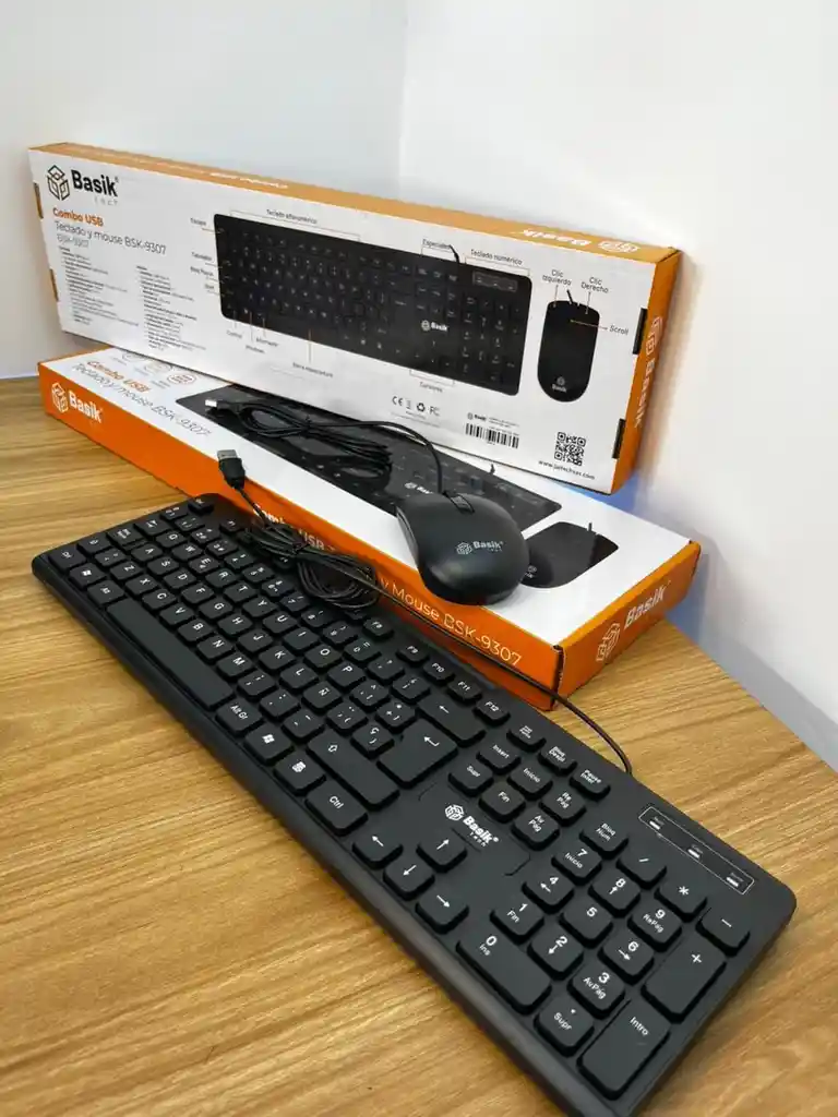 Combo Mouse y Teclado BASIK · Teclado: · Conexión alámbrica USB · Número de tecla: 104 · Altura ajustable de 2 posiciones · Conexión Plug and Play · Dimensiones(Alto x Ancho): 12.5cm x 43.5cm · Peso:376gr · Mouse: · Conexión alámbrica USB · Número de botones: 3 · Conexión Plug and Play · Color: Negro