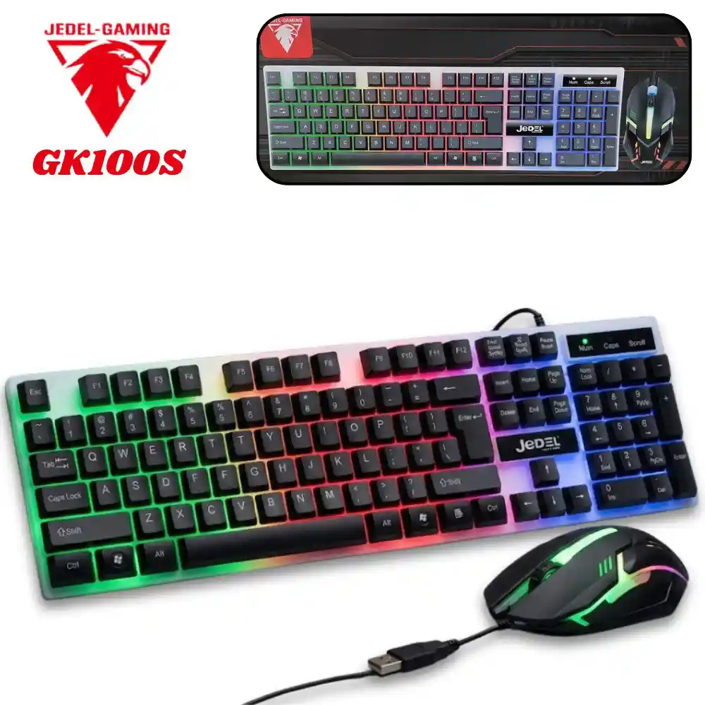 Combo Teclado Y Mouse Gamer Jedel Alambrico Gk100S Rgb Usb Gaming Keyboard. Con este kit de teclado y mouse Jedel llevarás tus partidas a otro nivel. Destinado a un público gamer, potencia tu performance en distintos juegos. Con este combo, podrás darle un uso intensivo a estos dispositivos y disfrutar de interminables horas de diversión. El mouse del combo posee un sensor óptico de alta precisión, el cual te permitirá redirigir el cursor de una manera más exacta y sensible que el resto de los sistemas tradicionales. CARACTERÍSTICAS: - Kit compuesto por teclado Gk100s y mouse Gk100s. - Aptos para Windows. - Mouse con sensor óptico y resolución de 1000 DPI. - Interfaz de conexión de los dispositivos USB 2.0. - Combinación perfecta y completa para cada partida.