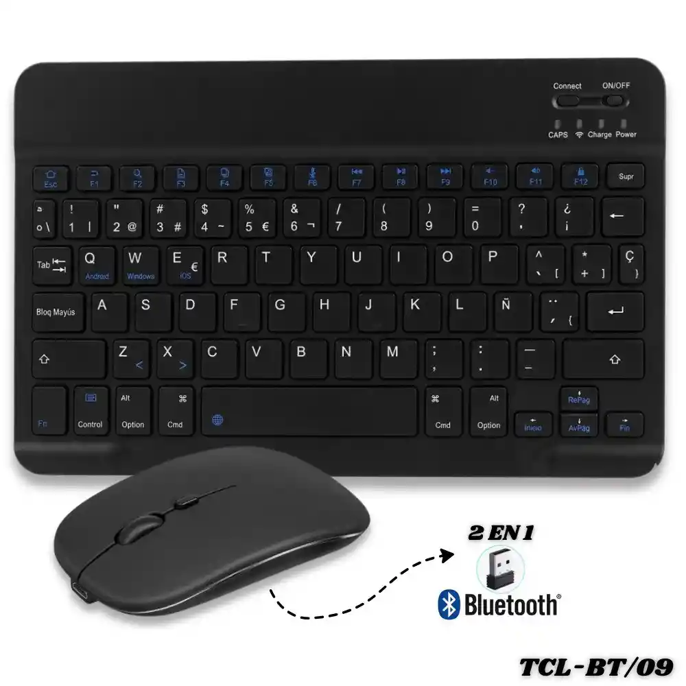 Combo Teclado Y Mouse Inalambrico Bluetooth Tcl-Bt/09 Recargable ¡Despídete de los cables y de las pilas! Este combo ultra-portátil y recargable es la solución perfecta para tu productividad y entretenimiento en movimiento. Con su conectividad dual, este combo de teclado y mouse se adapta a tu estilo de vida. Características: - Combo 2 EN 1: Incluye un teclado inalambrico en español completo y un mouse ergonómico, ambos recargables y listos para usar. - Conectividad Dual Inteligente: Conecta tu mpuse de forma inalámbrica a través de un receptor USB de 2.4GHz o utiliza la tecnología Bluetooth para emparejarlo con múltiples dispositivos, en cuanto la conectividad del teclado se realiza unicamente mediante Bluetooth. - Multisistema y Versátil: Totalmente compatible con Windows, Android e iOS. El teclado incluye leyendas específicas en la barra espaciadora para cambiar de sistema sin esfuerzo (Android Windows iOS). - Totalmente Recargable: Olvídate de comprar pilas. Ambos dispositivos cuentan con baterías recargables de larga duración que se recargan a través de puerto Tipo-C. - Teclas Fn Multi-Función & Atajos Multimedia: Accede rápidamente a controles de volumen, búsqueda y más con las teclas de función dedicadas. - Compacto y Ligero: Diseñado para la portabilidad, este combo es ideal para viajes, trabajo en remoto y espacios de trabajo reducidos. Especificaciones: - Modelo: TCL-BT/09 - Tipo de Conexión teclado: Inalámbrica Bluetooth. - Tipo de Conexión mouse: Inalámbrica 2.4GHz (vía receptor USB) y Bluetooth - Compatibilidad: Windows, Android, iOS. - Batería: Recargable. - Teclado en ESPAÑOL: Cuenta con Tecla Ñ. El paquete incluye: - Teclado Inalámbrico Bluetooth. - Mouse Inalámbrico. - Cable de Carga USB a USB-C.