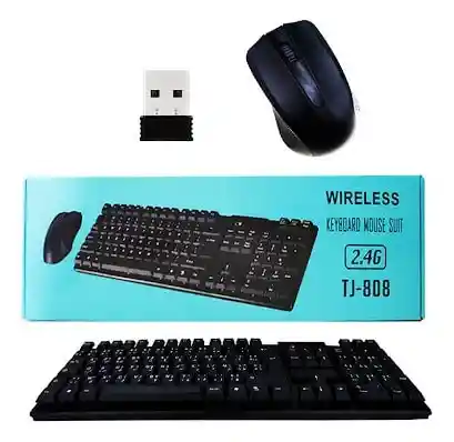 Teclado y Mouse inalámbricos modelo TJ-808, el teclado cuenta con diseño de teclas aéreas, el Mouse cuenta con 3 botones y rueda de desplazamiento. El Mouse funciona con 2 pilas AAA y el teclado funciona con 1 pila AA (No Incluidas)