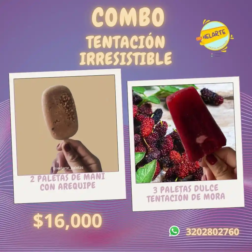 2 paletas de maní con arequipe + 2 de mora. Una combinación entre lo dulce, lo cremoso y lo frutal que no falla.