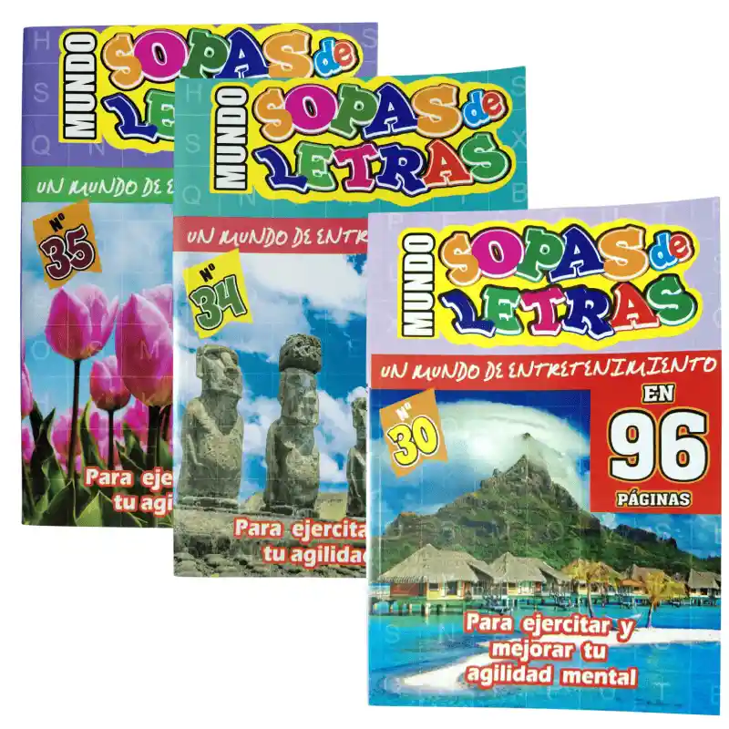 Disfruta horas de triple diversión con 3 cuadernos de sopas de letras de 96 paginas, ideal para ejercitar la mente, mejorar la concentración y pasar el tiempo de forma entretenida.