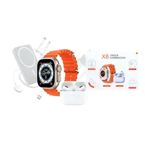Combo tecnológico X8 que incluye un smart watch, audífonos y un power bank, ideal para el uso diario. Una opción práctica que reúne conectividad, entretenimiento y energía portátil en un solo paquete.