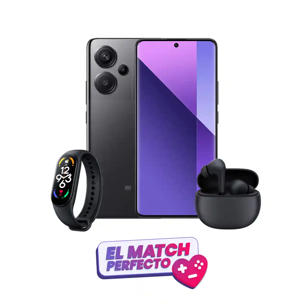 Xiaomi Redmi Note 13 Pro 256GB 8GB Celular Xiaomi Redmi Note 13 256GB/8GB RAM - Negro Redmi Note 13 captura la grandeza cámara de 108MP y una pantalla AMOLED de 120Hz. 108MP Cámara principal ultra nítida, crea fotos impresionantes con la cámara principal flagship de 108 MP y varios algoritmos inteligentes. El algoritmo subyacente de Xiaomi Imaging Engine garantiza velocidades de inicio más rápidas y fotos más nítidas, para que cada toma sea excepcional. Pantalla AMOLED de gama alta, con una pantalla de 6.67” y un diseño de bisel ultrafino, esta atractiva pantalla ofrece una amplia gama de colores DCI-P3 al 100% y una profundidad de color de 8 Bits para proporcionar una experiencia visual envolvente y cautivadora Con una tasa de refresco de 120 Hz*, el Redmi Note 13 es increíblemente fluido y satisfactorio para utilizarlo en todo tipo de tareas, incluido el desplazamiento por redes sociales y la navegación por Internet. Equipado con una avanzada tecnología de proceso de 6 nm, Snapdragon® 685 ofrece un rendimiento fluido y estable que se adapta al uso diario. Esta serie cuenta con un mínimo de 128 GB de ROM, con un máximo de 8 GB+256 GB disponible, para que puedas almacenar tantas fotos de viajes, vídeos de fiestas y recuerdos valiosos como quieras sin tener que borrar nada. Añade hasta 8 GB* de RAM con la tecnología de fusión de memoria, que permite que el dispositivo realice varias tareas sin retrasos y cambie sin problemas entre aplicaciones. Características Procesador: Snapdragon® 685 Almacenamiento y RAM: 8 GB+256 GB Dimensiones: Altura: 162,24 mm Anchura: 75,55 mm Grosor: 7,97 mm Peso: 188,5 g Pantalla AMOLED de 6,67'' Tasa de refresco: Hasta 120 Hz Resolución: 2400 x 1080 Cámara triple de 108 MP + 8 MP + 2 MP Cámara frontal de 16 MP Batería: 5000 mAh (typ) Sistema operativo: MIUI 14 Smartwatch Xiaomi Mi Smart Band 7 El Smart Watch Xiaomi Smart Band 7 es el dispositivo perfecto para aquellos que desean mantenerse activos y controlar su salud en todo momento. Diseñado para hombres y mujeres, este reloj inteligente ofrece una amplia gama de características que te ayudarán a alcanzar tus objetivos de bienestar de manera efectiva. Resistencia al algua de hasta 5 ATM. Monitoreo de frecuencia cardiaca. Monitoreo del sueño. Detección de actividades deportivas. Todo se presenta en detalle en alta resolución. Aún mejor, gracias al modo siempre activo, puede leer la fecha y la hora sin levantar la muñeca ni usar los dedos. Sensor de frecuencia cardíaca (con sensor de oxígeno en sangre) | Acelerómetro | Giroscopio | Sensor de luz ambiental Tipo de carga: carga magnética Tiempo de carga: aproximadamente 60 minutos Tiempo de uso normal: ≥12 días Capacidad: 235 mAh Monitoreo de frecuencia cardíaca Seguimiento de SpO₂ La función SpO₂ no está diseñada para el diagnóstico, la prevención, el monitoreo, la predicción o el pronóstico de ninguna enfermedad, la investigación de procesos fisiológicos ni para ningún otro propósito médico. Todos los datos y el seguimiento se deben utilizar solo con fines de referencia personal y de bienestar. Si no te sientes bien, utiliza dispositivos médicos profesionales o busca la ayuda de un médico. Monitoreo del sueño Seguimiento de salud femenina No debes utilizar esta función ni basarte en ella para ningún propósito médico. Es posible que no anticipe adecuadamente tus ciclos menstruales o la información relacionada. Todos los datos y el seguimiento se deben utilizar solo como referencia personal. Monitoreo del estrés Ejercicios de respiración Audífonos Redmi Buds 4 Marca: Xiaomi Redmi Modelo: Buds 4 Lite Auriculares: Drivers de 12 mm Micrófono incorporado Reducción de ruido inteligente en llamadas: aumenta la voz del interlocutor Conexión inalámbrica: Bluetooth v5.3 Alcance de 10 m Características: TWS Resistencia al agua y al polvo IP54 Compatibles con el sistema de emparejado rápido de MIUI Batería: Tiempo de uso: Hasta 5 horas (Auricular)/hasta 20 horas (Caja de carga) Tiempo de carga: Hasta 2 horas Carga mediante USB-C Dimensiones: 1.96 x 1.82 x 3.22 cm (Auricular)/4.73 x 5.56 x 2.22 cm (Estuche de carga) Peso: 3.9 gr (auricular)