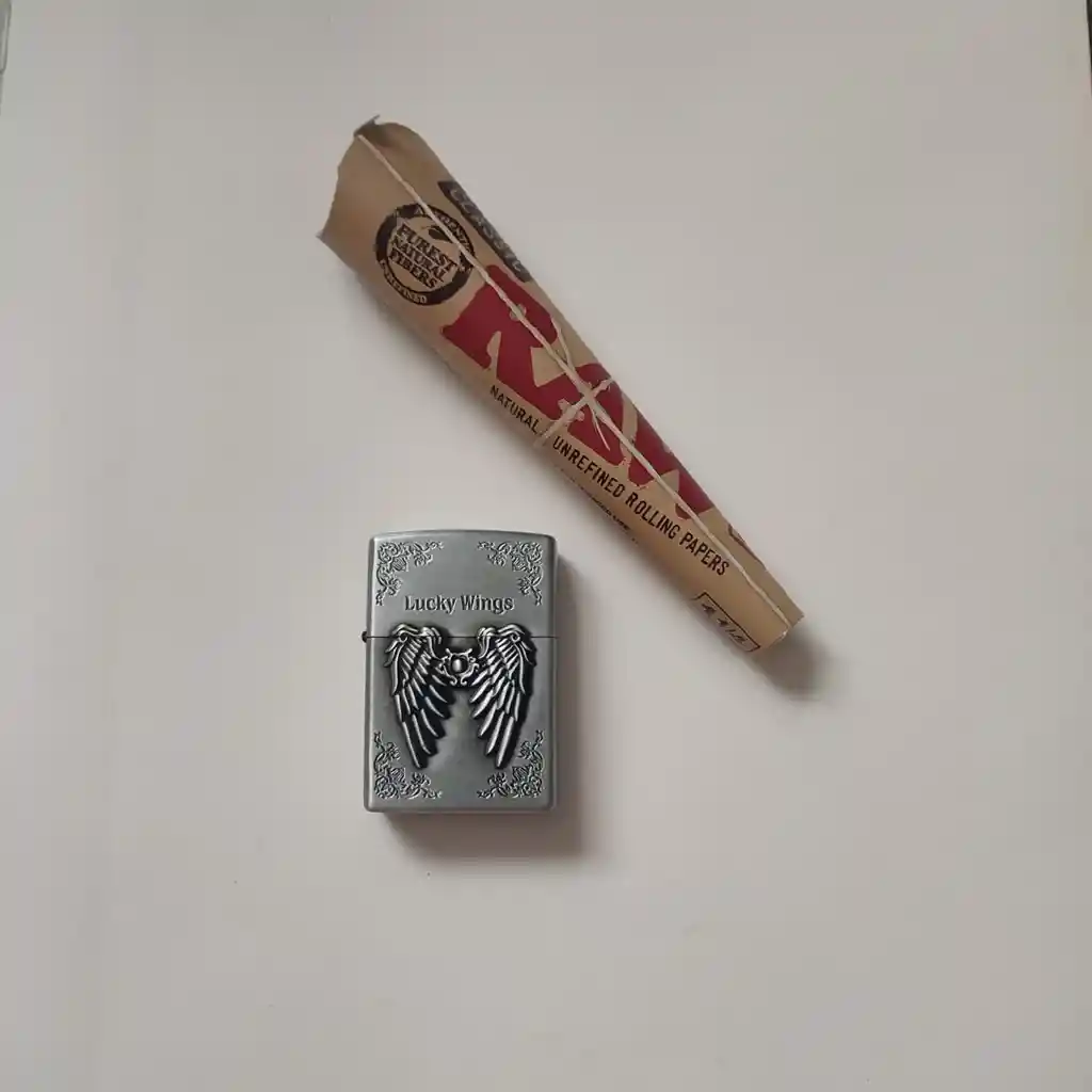 Zippo metálico recargable, cargado. Paquete de cono RAW, 6 unidades de rolling papers armados, talla 11/4