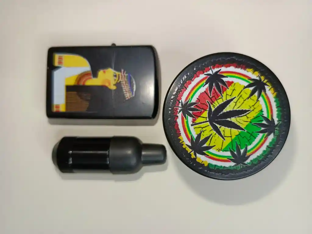 Combo de trilladora metálica con tapa magnética, zippo recargable (se entrega cargado), pipa pequeña de fácil uso y mantenimiento.