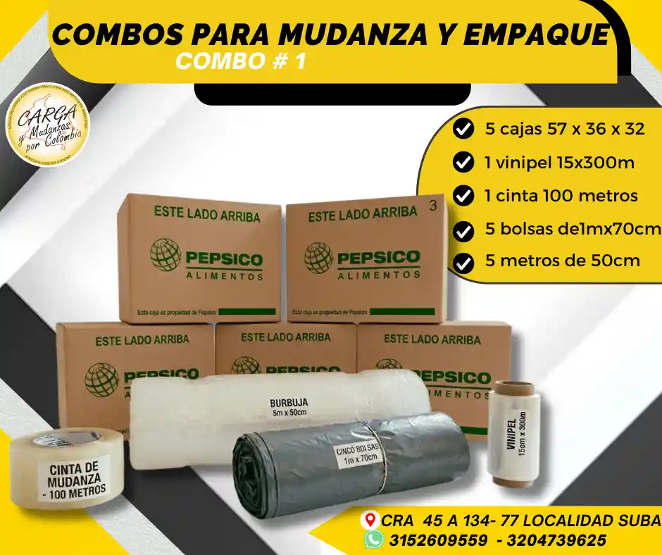 En carga y mudanza por colombia te ofrecemos los mejores combos a un precio asequible . Que incluyen : ✅ 5 cajas medianas ✅ 5 metros de burbuja de 50 cm de alto ✅ 1 cinta de 100 metros ✅ 5 bolsas de 1m de alto x 70 cm de ancho ✅ 1 vinipel de 15 cm de alto x 300 metros de largo Alta Calidad - Producto Garantizado. Visítanos: Cr. 45a # 134 - 77 Local Esquina Contáctanos: 315 2609 559 *ASESORIA SIN COSTO POR WHATSAAP*