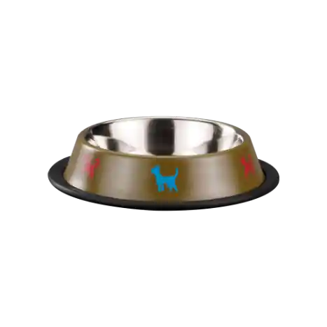 Plato Multicolor para mascotas hecho en acero inoxidable. Color mate con perritos, ancho de 16cm y alto 4cm.