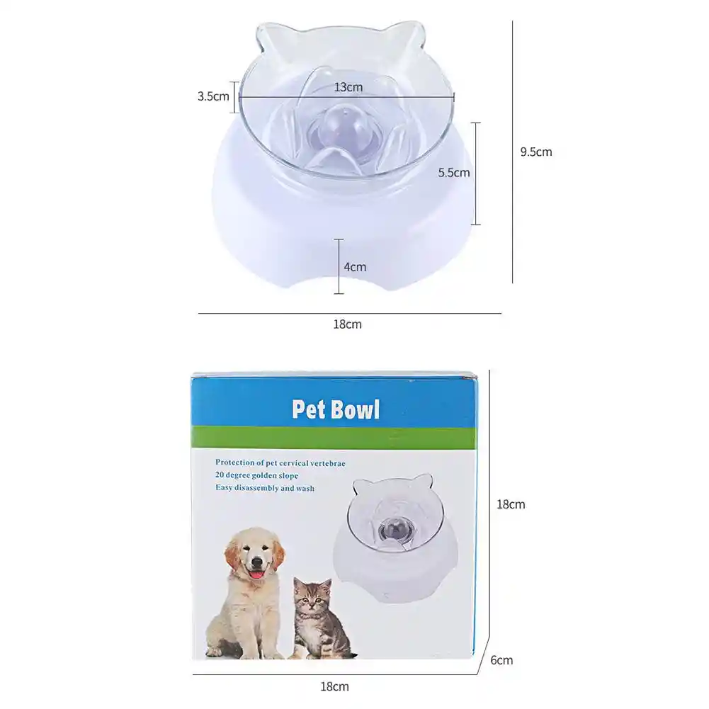 Este comedero de alimentación lenta está diseñado específicamente para mejorar la digestión de las mascotas al obligarlas a comer de manera más pausada. Su estructura cuenta con un plato superior transparente que incluye protuberancias internas en forma de laberinto, las cuales actúan como obstáculos para evitar que el animal ingiera grandes cantidades de alimento de un solo bocado. La base es de color blanco sólido y el diseño del plato incorpora dos pestañas superiores que asemejan orejas de gato, dándole un toque estético moderno y funcional que ayuda a reducir problemas como la asfixia o el malestar estomacal.