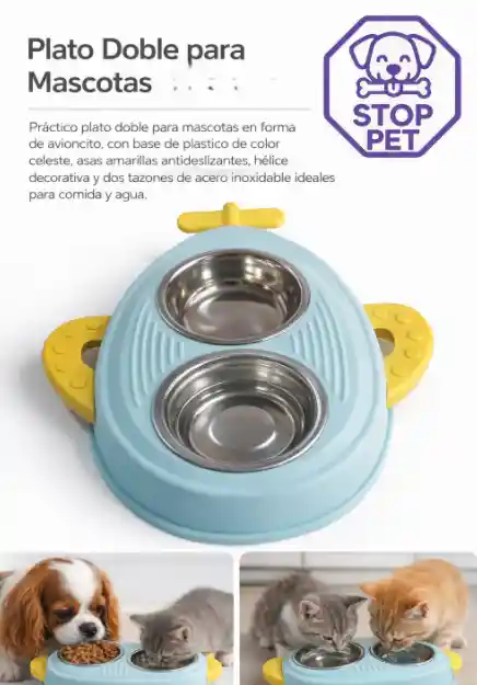 El comedero tipo "avioncito" con platos de acero es un sistema elevado ajustable para mascotas que mejora la postura al comer y reduce la tensión en el cuello y articulaciones. Consta de un soporte (base) y platos removibles de acero inoxidable, ideales para agua o comida, garantizando higiene y fácil limpieza.