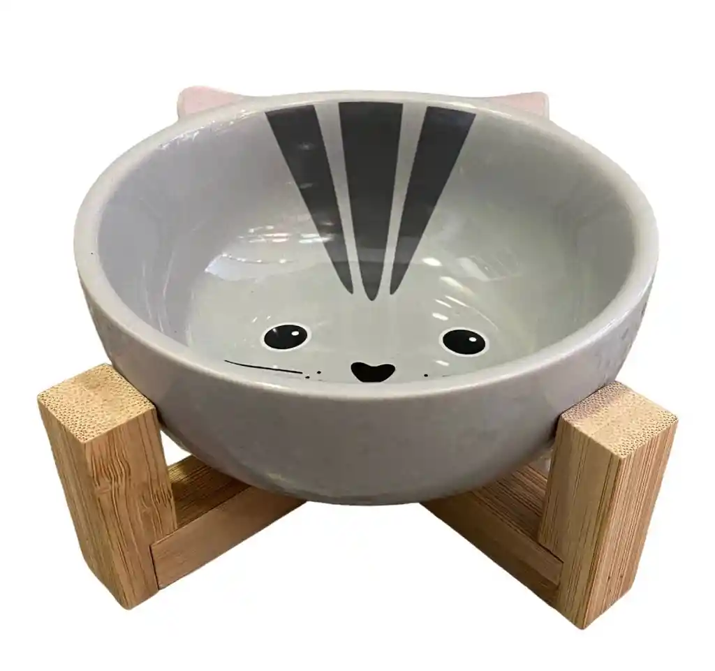 Comedero/bebedero en cerámica con base de madera. Grabado con cara de gato. Medida del plato: 13 cm de diámetro x 5 cm de profundidad.