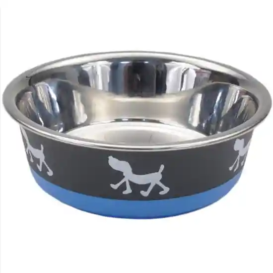 Este plato para mascotas combina durabilidad y estilo, fabricado en acero inoxidable de alta calidad para garantizar una higiene óptima y resistencia a la corrosión. Su diseño exterior presenta una elegante banda negra con siluetas de perros, complementada con una base antideslizante en color azul que evita desplazamientos y ruidos mientras tu mascota come o bebe. Es una opción fácil de limpiar, segura para el contacto con alimentos y perfecta para el uso diario de perros o gatos.